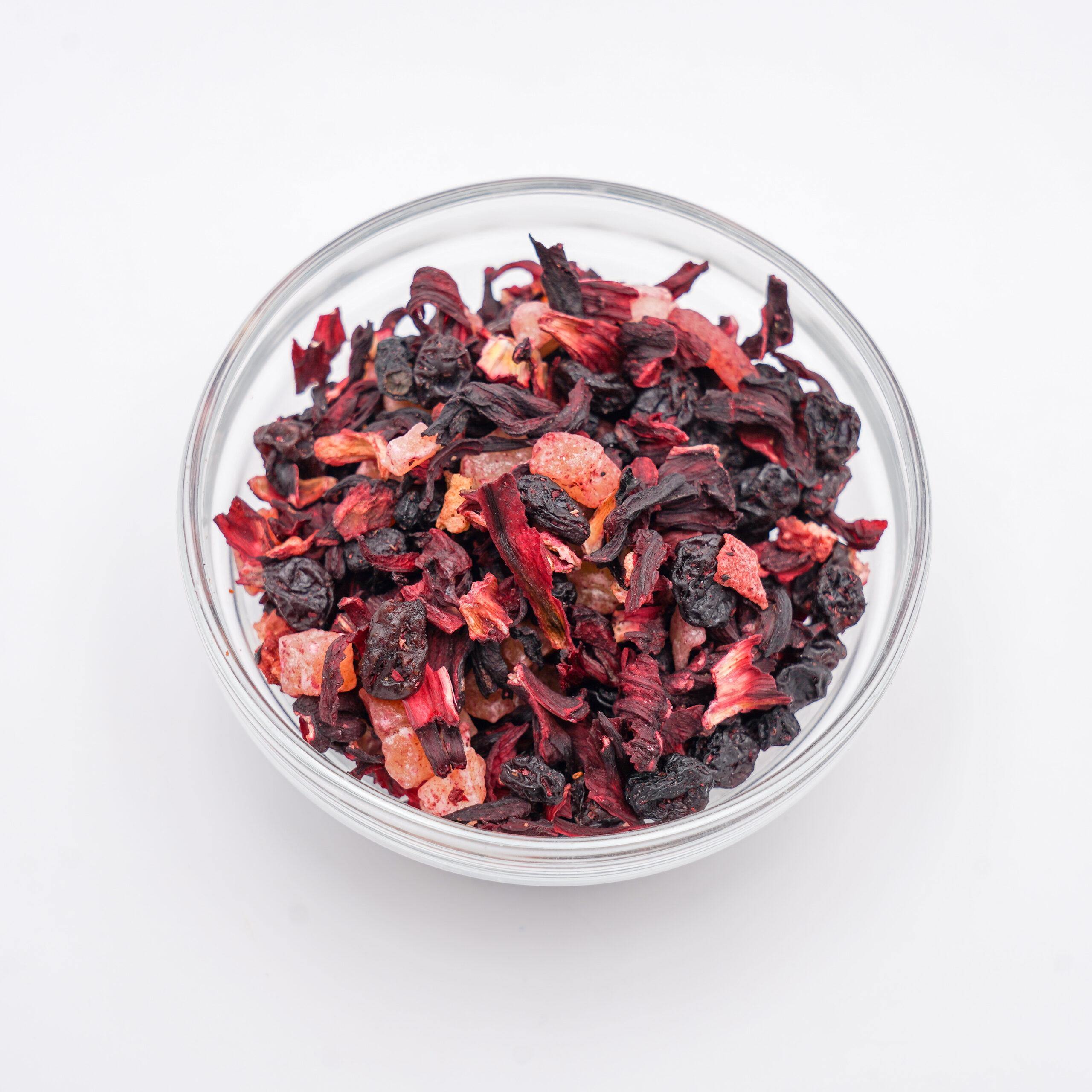 Hibiskusblüten, Korinthen, Papayawürfel (Papaya, Zucker), Fliederbeeren, Aroma, gefr.-getr. Himbeerstücke, gefr.-getr. Erdbeerstücke, schwarze Johannisbeeren, Heidelbeeren.